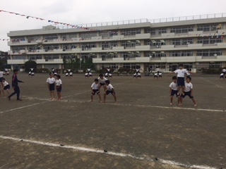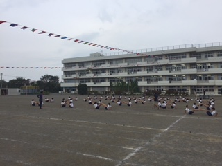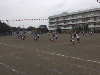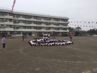 万国旗の下での5年生組体操は、本番のような緊張感で演技をすることができたようです。