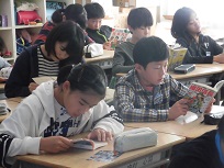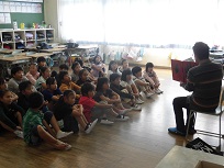 月曜日の朝は全校読書の日です。今週は、低学年、ひまわり・こすもすが「おはなしてんとう虫」さんによる読み聞かせで、3年生以上は読書タイムでした。