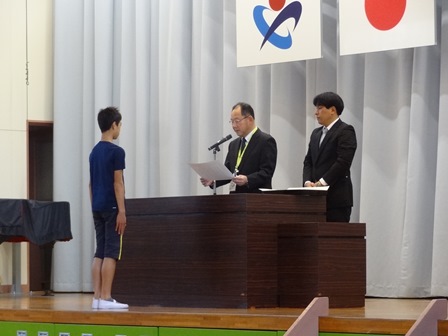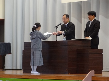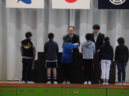 今学期も多くの児童が作文や絵などで表彰され、大きな返事の声が体育館に響きわ