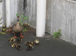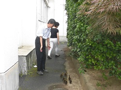 今日の青空タイムの時・・・カルガモの親子合計9羽が学校に迷い込んできました!