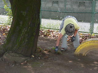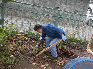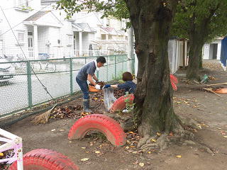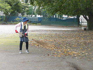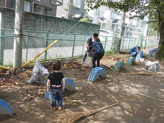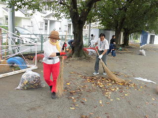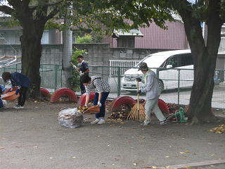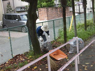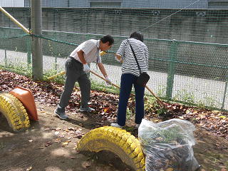 11名の方にご協力いただき、校庭南側フェンス沿いの落ち葉はきと草むしりを行いました。
