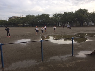 幸運にも日が照りだし、水たまりを避け、わずかですが校庭で練習をすることができました。